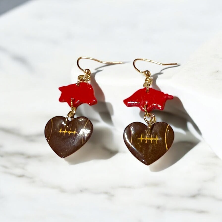 Elevate your game day look with our Arkansas Football Dangle earrings. These lightweight, hypoallergenic earrings feature the iconic Arkansas football and are perfect for showing your team spirit. Stay stylish and comfortable all season long.