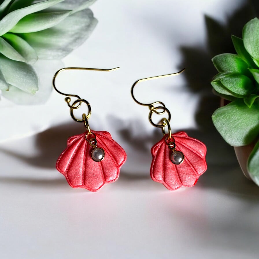 "Experience the beauty of the ocean with our Coral Seashell Dangle earrings. Each earring features a seashell-shaped polymer clay in a stunning pearlescent coral hue. Add a touch of elegance to any outfit and embody the serenity and charm of the sea. Perfect for any beach lover or nature enthusiast!"