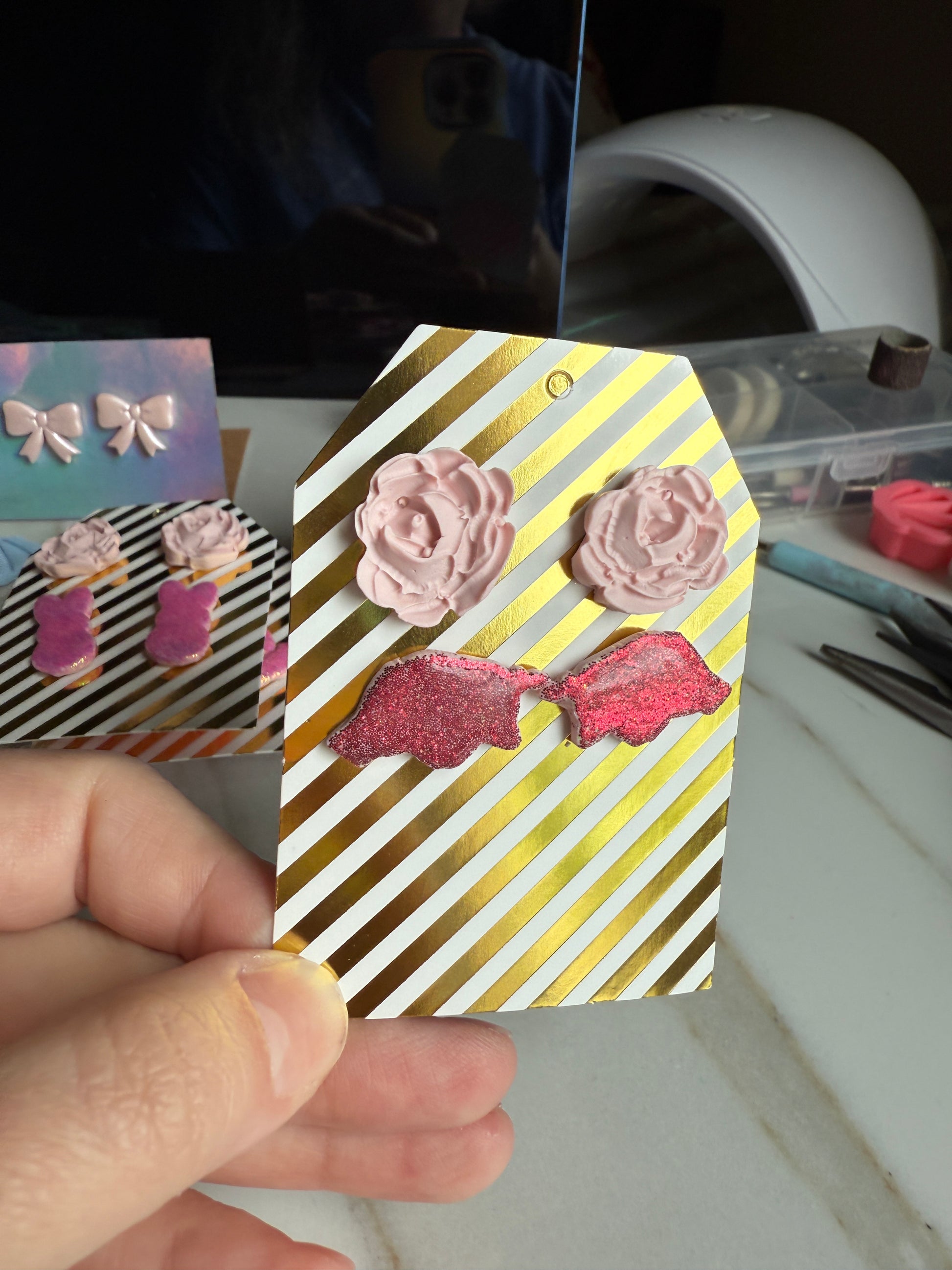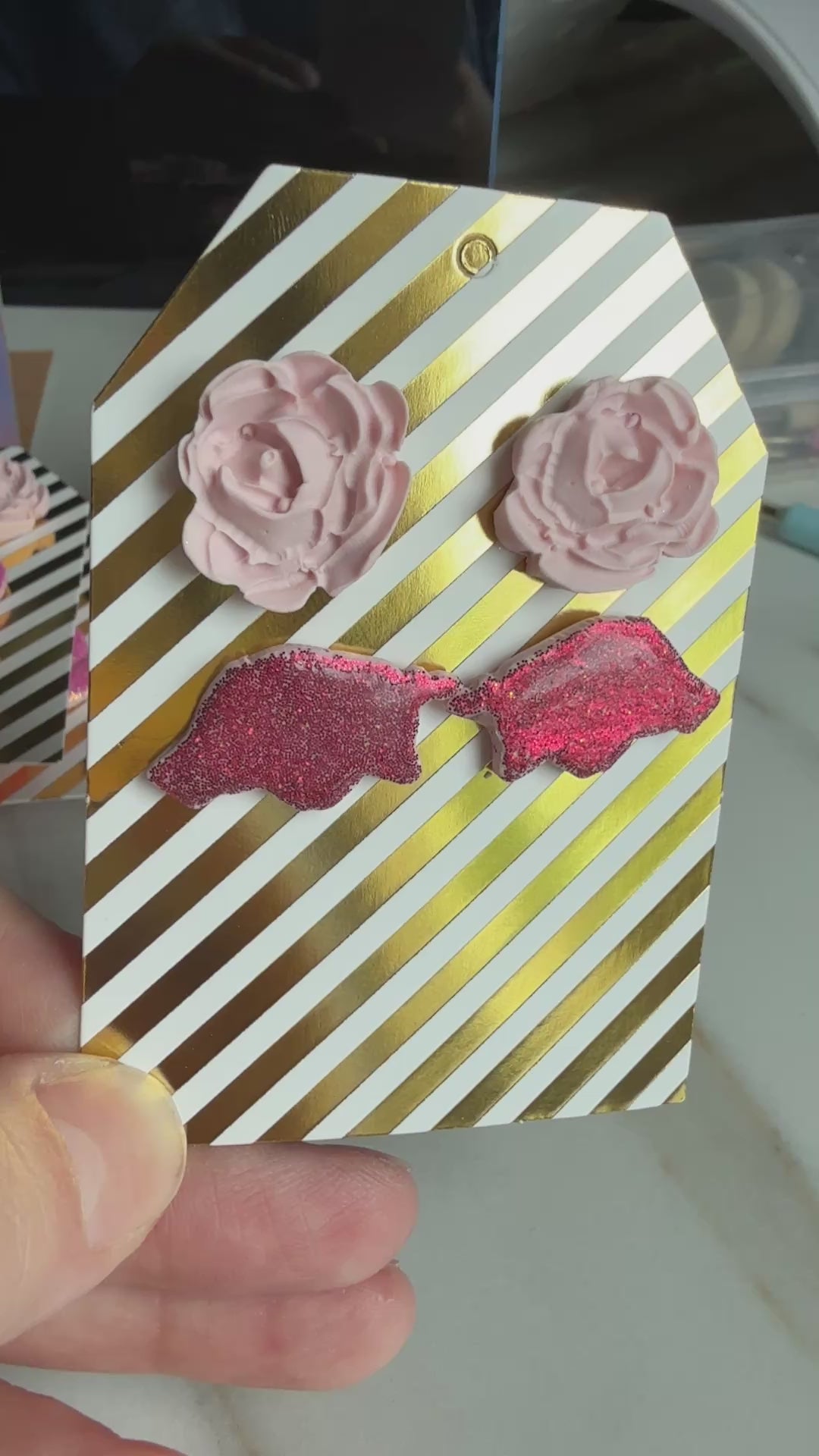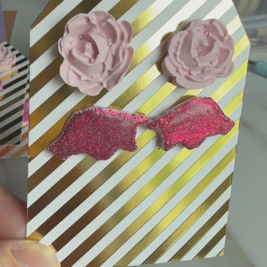 Elevate your style with our Rose and Razorback Studs. Show off your playful side with a set of delicate rose studs, or make a bold statement with glittery razorback studs. Perfect for any occasion, these earrings are sure to add a touch of charm to your look.
