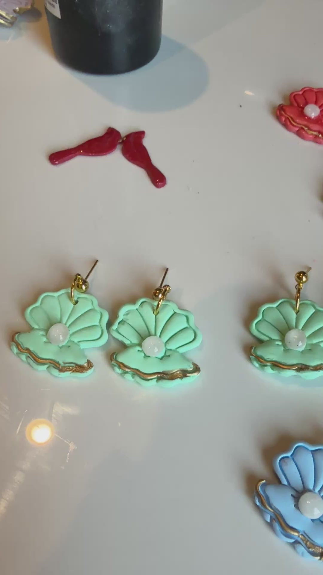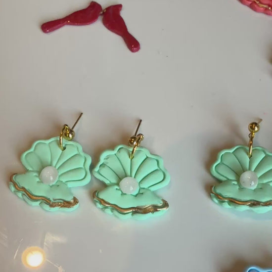 Introducing our Clam Dangle earrings - handmade with love and care. These elegant earrings feature a delicate pearl, sculpted from high-quality polymer clay, and are attached to hypoallergenic studs for comfortable wear. Add a touch of seaside charm to any outfit.