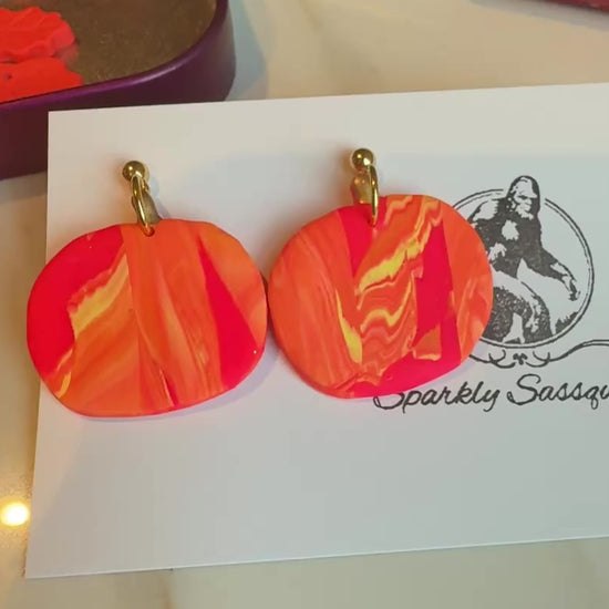 Add a playful pop of color to your fall wardrobe with our Wonky Marbled Pumpkins! These charming dangle earrings are a unique blend of pink, orange, and yellow, creating a whimsical marbled effect. Perfect for any pumpkin lover, these earrings are sure to make a statement (without being too serious).